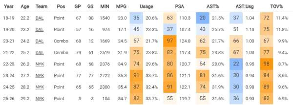 从独行侠到尼克斯的巅峰赛季,布伦森的回合占有率提升了10%,同时助攻率也上涨了8-9%。