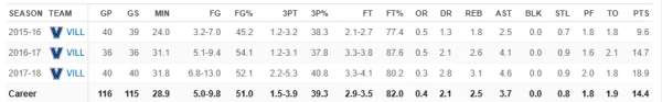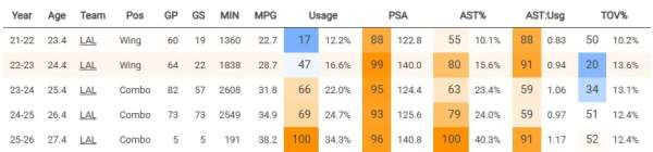 常见的数据项就不解释了。“PSA”代表包含了罚球和犯规倒数罚球的百次出手得分——可以理解成类似于更精准的“真实命中率”,是一个代表得分效率的数据。(带背景颜色的数字代表此数据超过同位置球员的百分比)