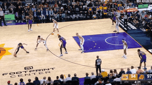 这次面对里德的换防,里夫斯展现了他“反省”后努力训练取得的进步——没有多余的动作,虚晃一下假装给艾顿立马下球突破,里德没有跟上他的第一步,让里夫斯突进来后里德就不好操作了——他得起跳封盖,但他跳,就会有被里夫斯用假动作晃的风险。
